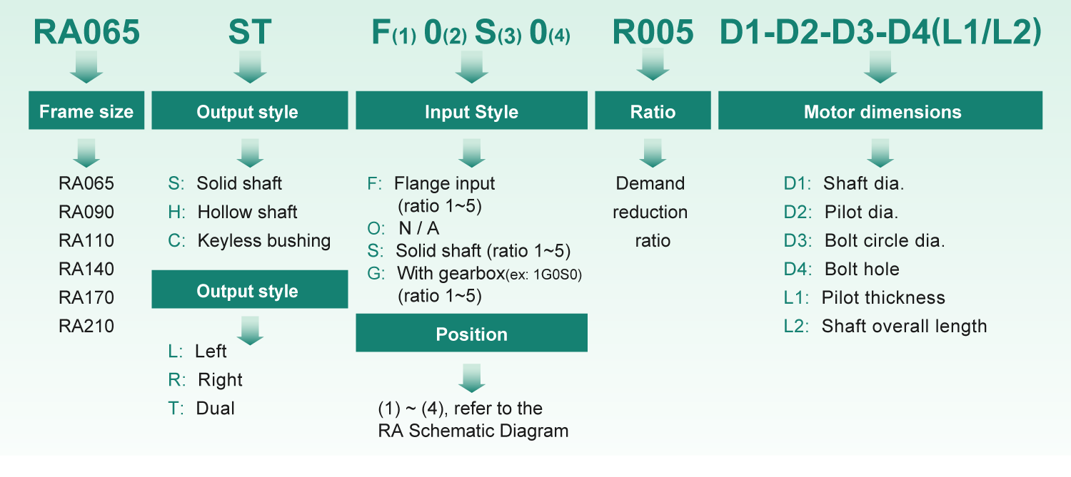 - Example: the directions (L) and (R) are the output side, which outputs the torque, and the reduced speed through the reduction ratio.